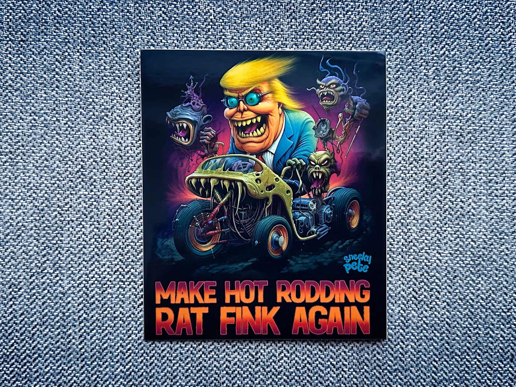 Nyckelord: Donald Trump, Tonald, Drump, Rat Fink, hot rod, Ed Roth, hot rodding, klistermärke, dekal
