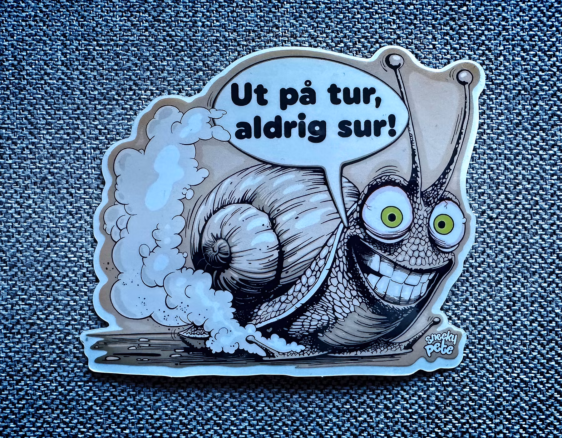 Nyckelord: Ut på tur, aldri sur, raggen går, åktur, snigel, turbo, lowbrow, kustom kulture, klistermärke, dekal
