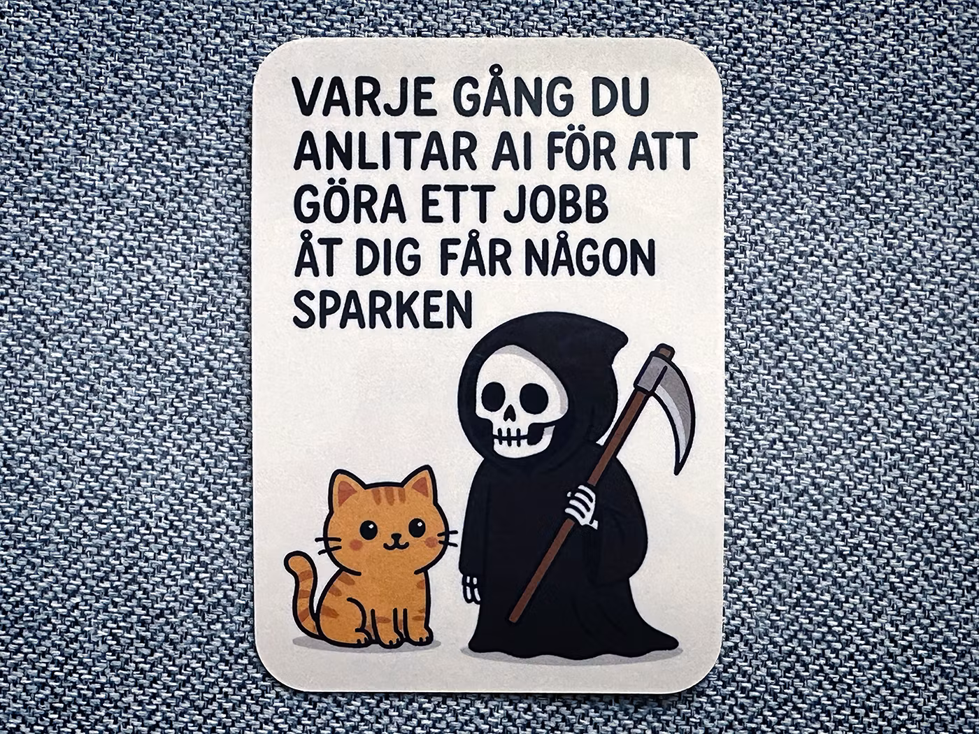 Hem › Dekaler, övriga › Varje gång du anlitar AI Varje gång du anlitar AI I lager. 0 kr 20 kr Köp Leverantör: Sneeky Mått: 7 x 10 cm.Nyckelord: konstgjord intelligens, AI, artificiell intelligens, sparken, klistermärke, dekal Flera populära produkter Alltid retar den någon 35 kr Läs mer Riskradion I 25 kr Läs mer Betty Ford Center 35 kr Läs mer Det flygande spaghettimonstret 30 kr Läs mer